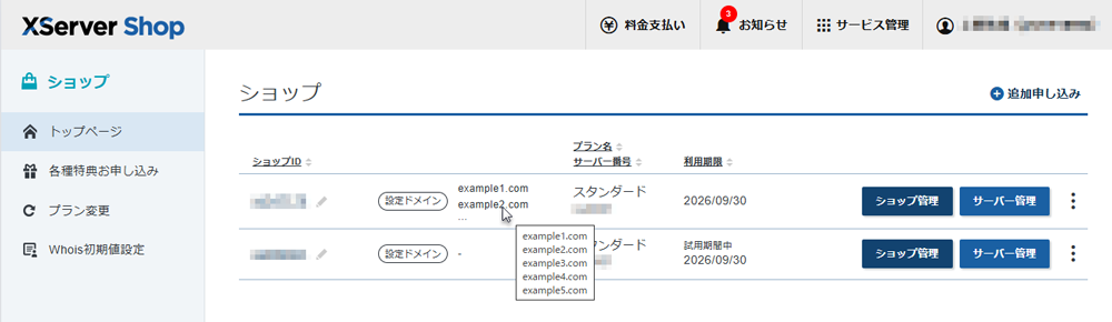 一覧画面では最大2件のドメインが表示され、